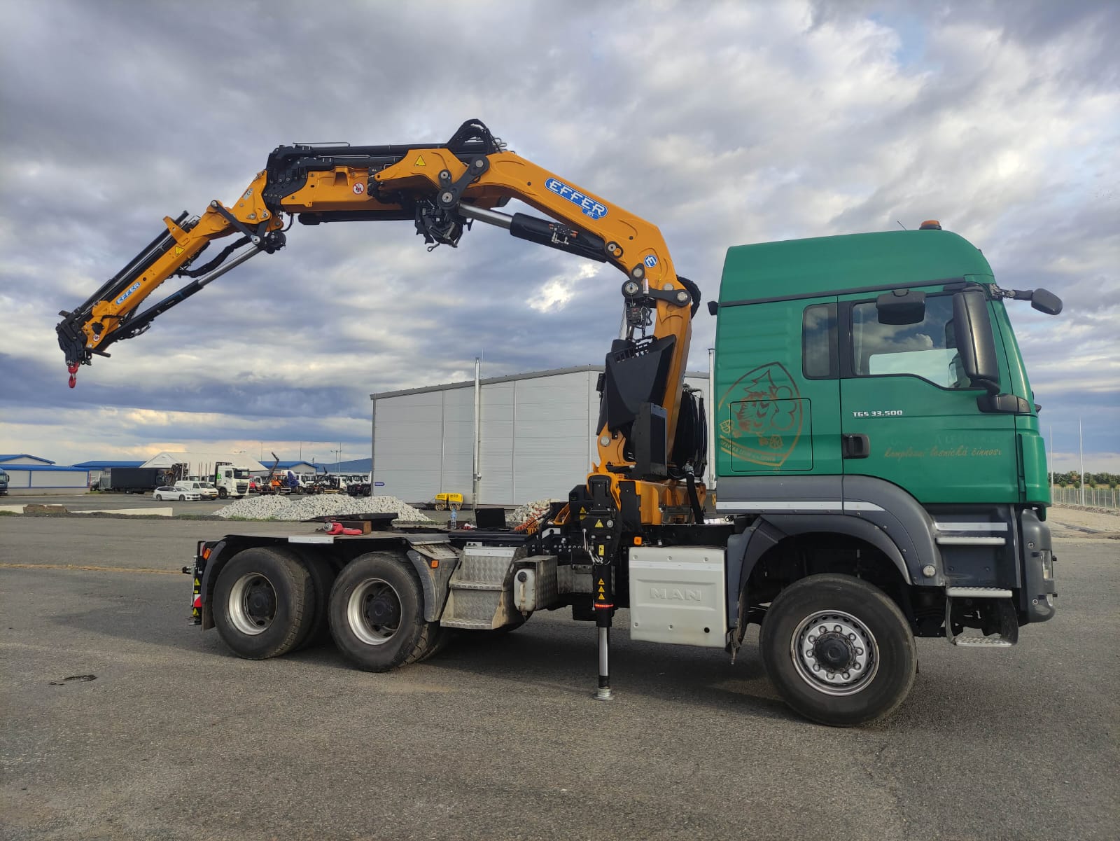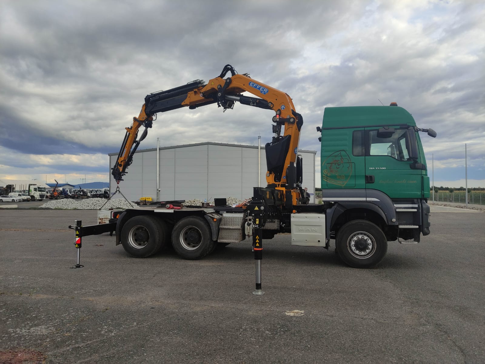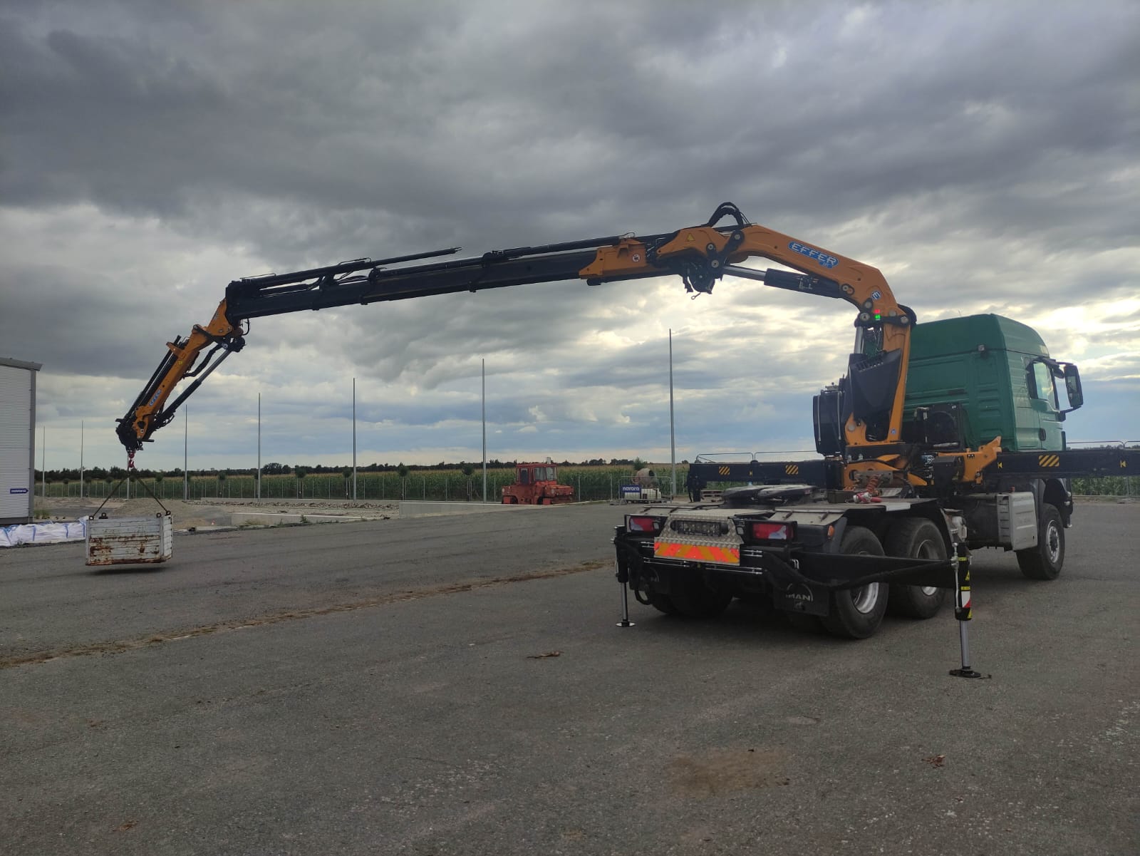 Effer 395 6S 4S. Jeřáb s nekonečnou otočí, vodorovný dosah 26,5m, nosnost 510 kg. Výškový dosah 30 m. Jeřáb s dálkovým ovládáním, JIB, naviják 2,5 t.