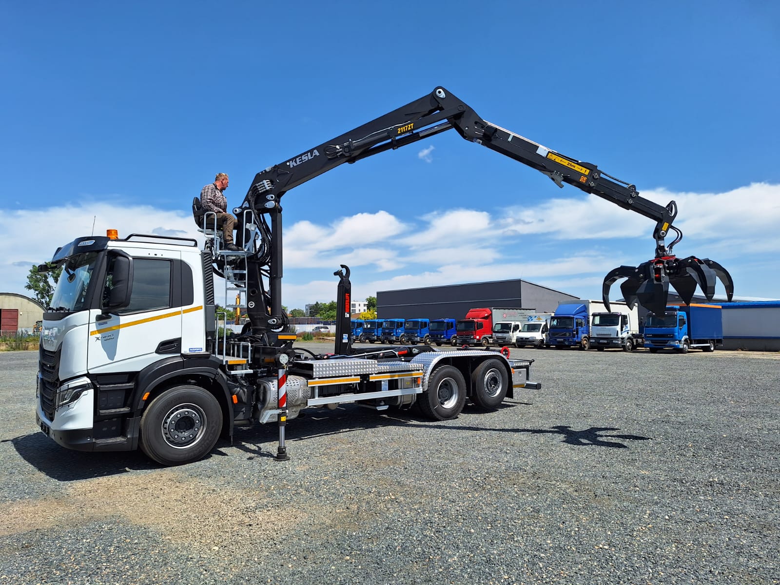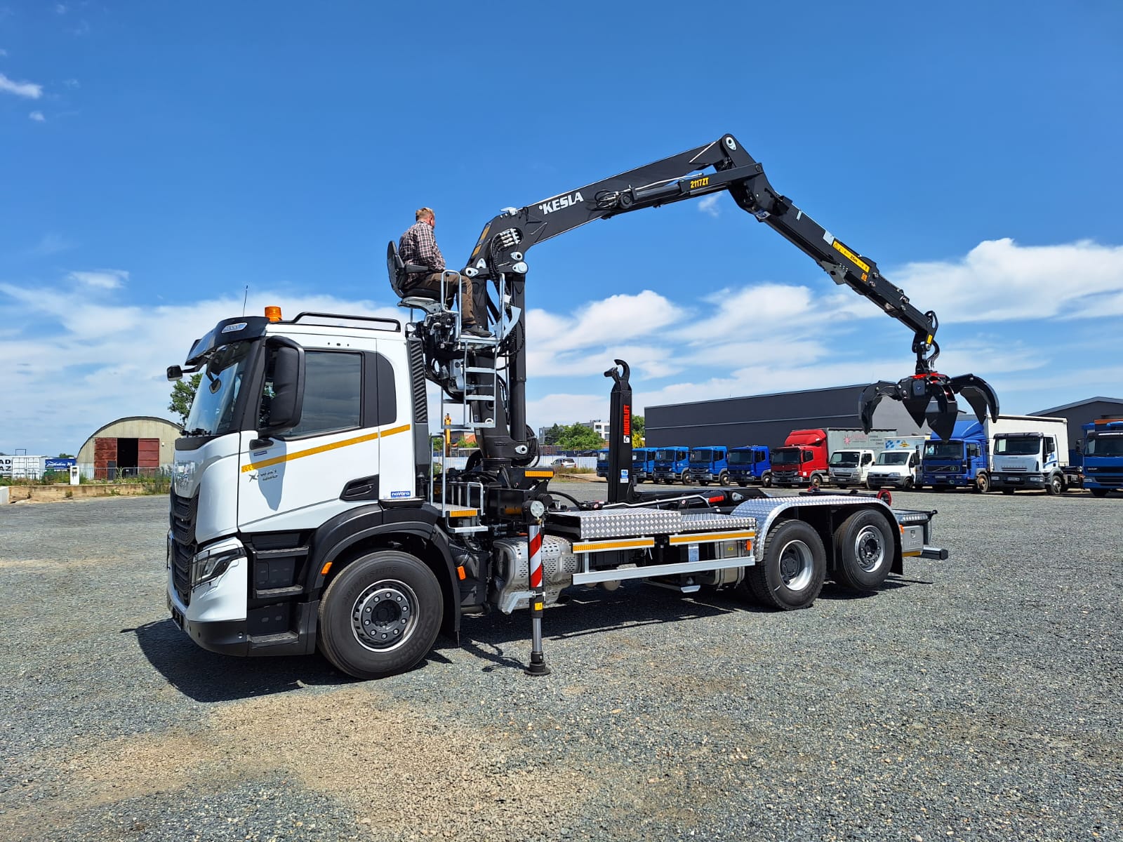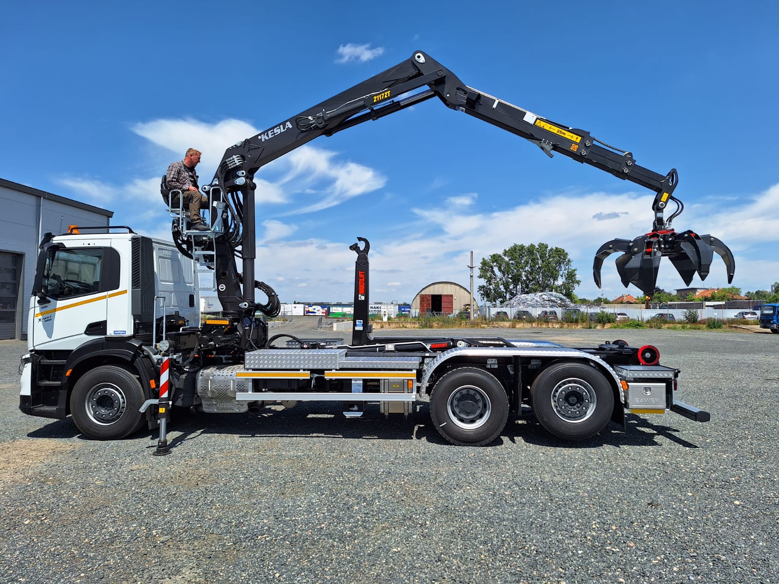 Realizace IVECO X-WAY 6X2 s nosičem kontejnerů MULTILIFT ULTIMA 21S56 pro kontejnery max délky 7m. Jeřáb KESLA 2117ZT 94, výbava Recykling Kit, hydraulický dosah 9,4m a polypový drapák Ferrari 254/6 vyosený.