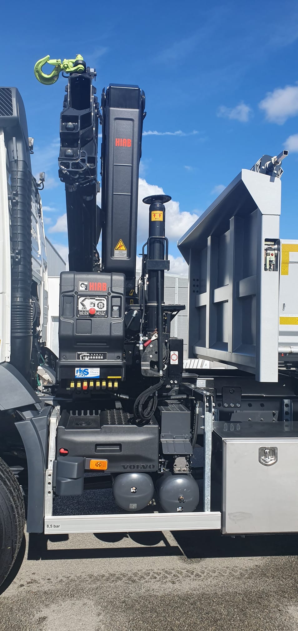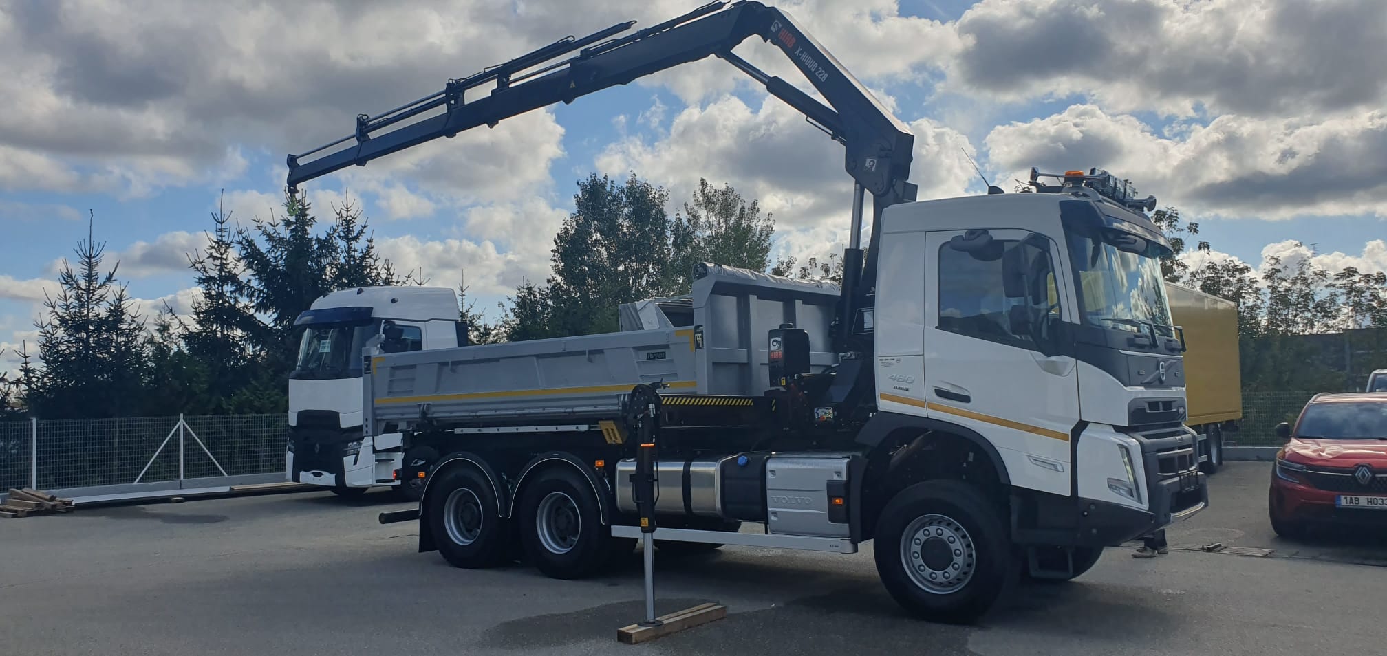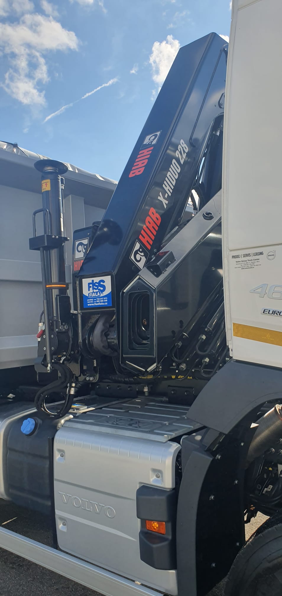 Volvo 6×6 nástavba 3S Porgest. HIAB X 188B4 s dálkovým ovládáním, automatické rozložení a složení jeřábu z a do přepravní polohy, VSL sledování stability jeřábu.